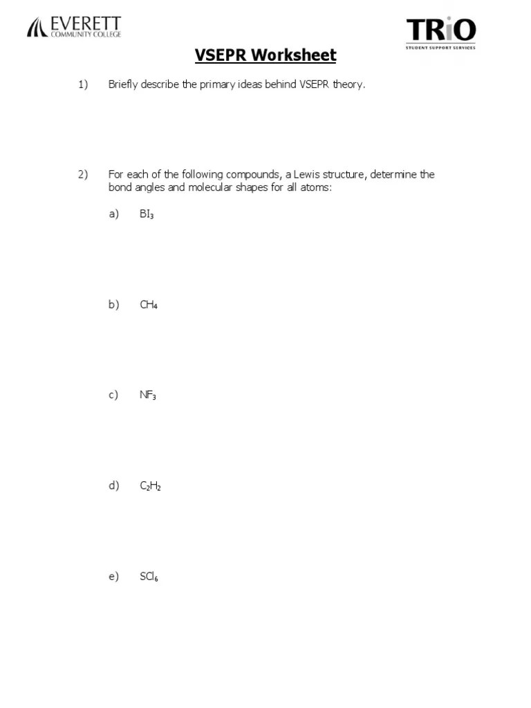For each of the following compounds, draw a lewis structure, determine the axe. Briefly describe the primary ideas behind vsepr theory. Determine the lewis structure, vsepr electronic geometry, vsepr molecular geometry, polarity, vb hybridization for the following molecules using only your periodic table as a guide. Chem 101 key worksheet 17 dr.